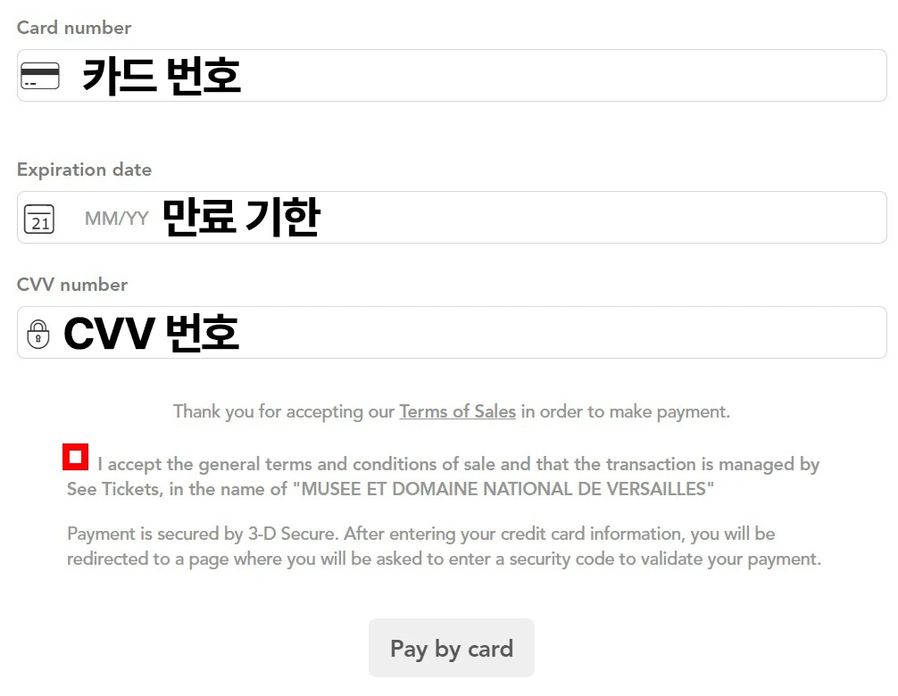카드 정보를 입력하신 후, 티켓 결제를 진행해 주시길 바랍니다. 결제가 완료되면, 아까 입력하신 이메일로 티켓이 발송될 거예요!