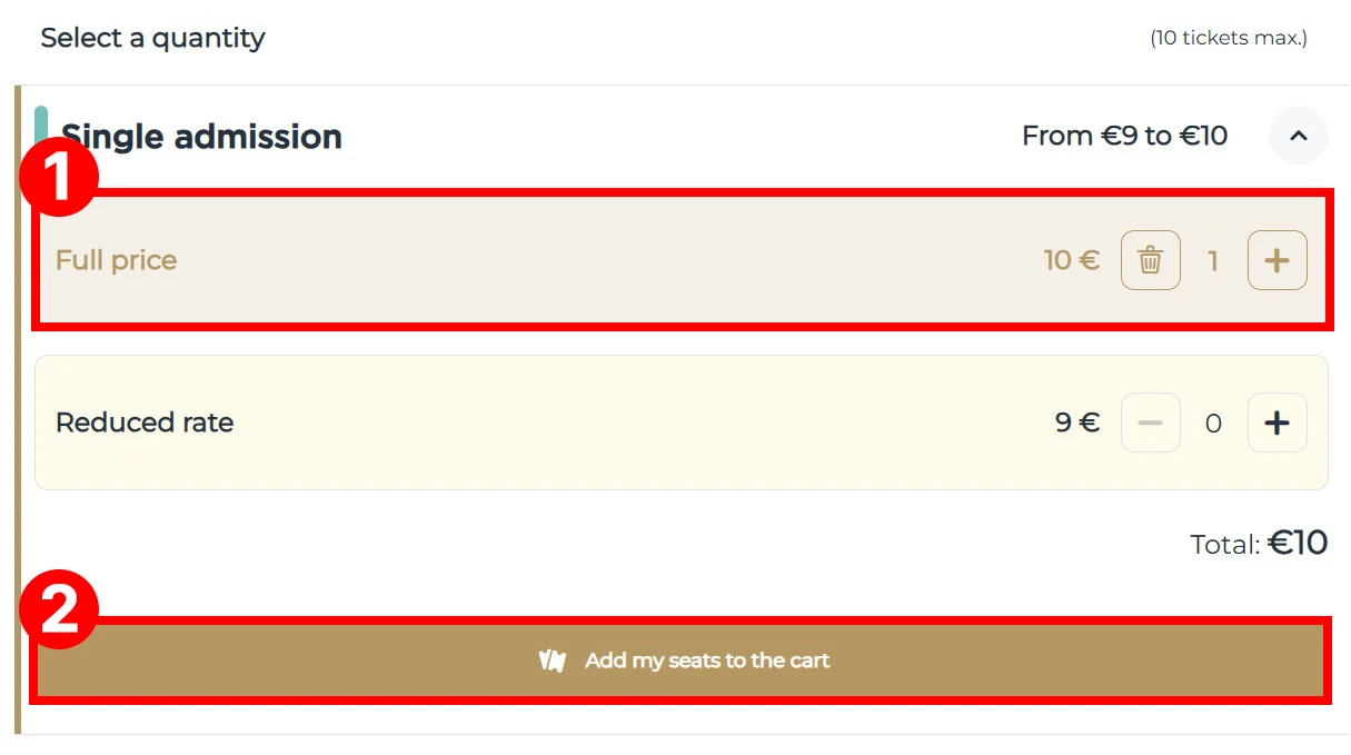 일반 티켓은 'Full price'을 선택해 주시면 됩니다. 티켓 개수를 고르셨다면, 아래 'Add my seats to the cart' 버튼을 클릭해 주세요.