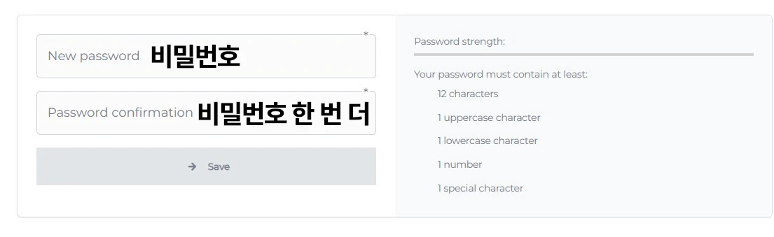 비밀번호는 대문자, 소문자, 숫자, 특수문자를 각각 1개씩 넣어 최소 12자 이상 설정해 주셔야 합니다.
