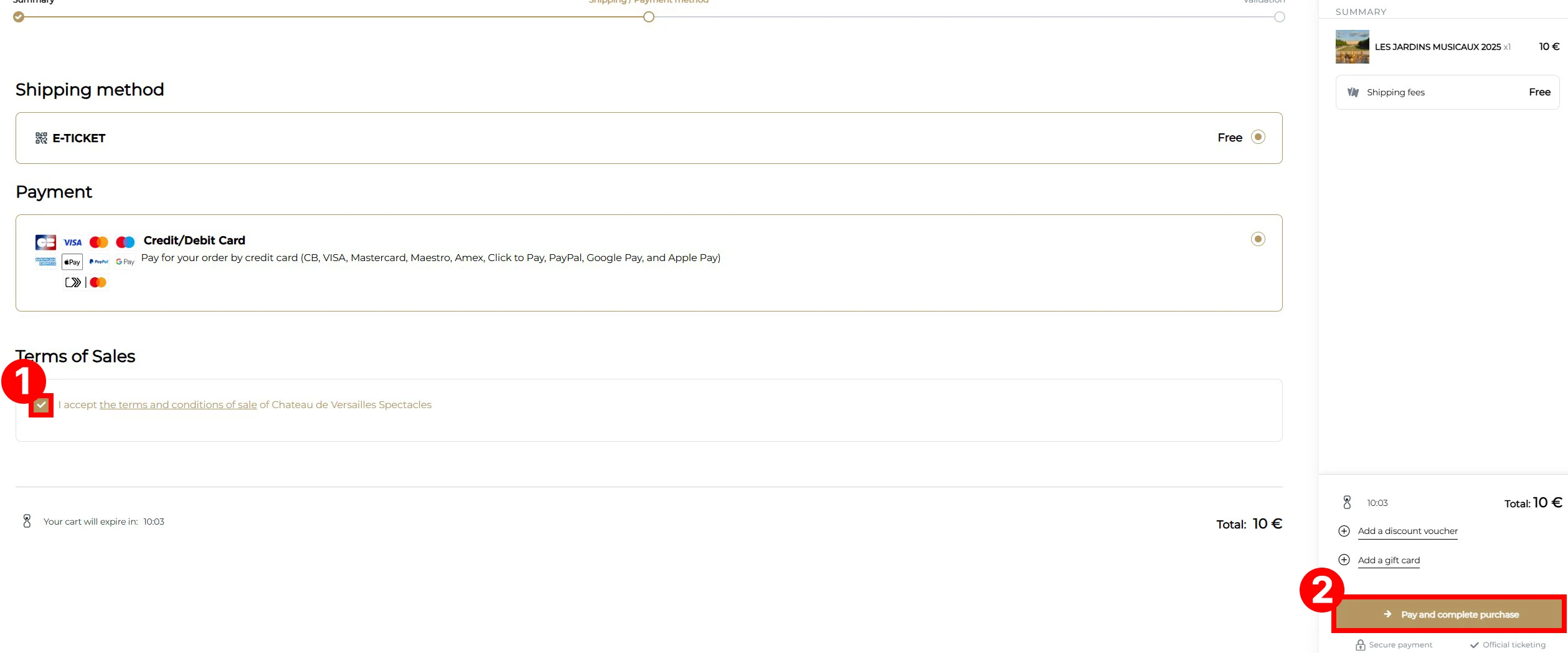약관 동의 박스를 체크하신 후, 가장 오른쪽 하단 'Pay and complete purchase' 버튼을 클릭해 주세요.