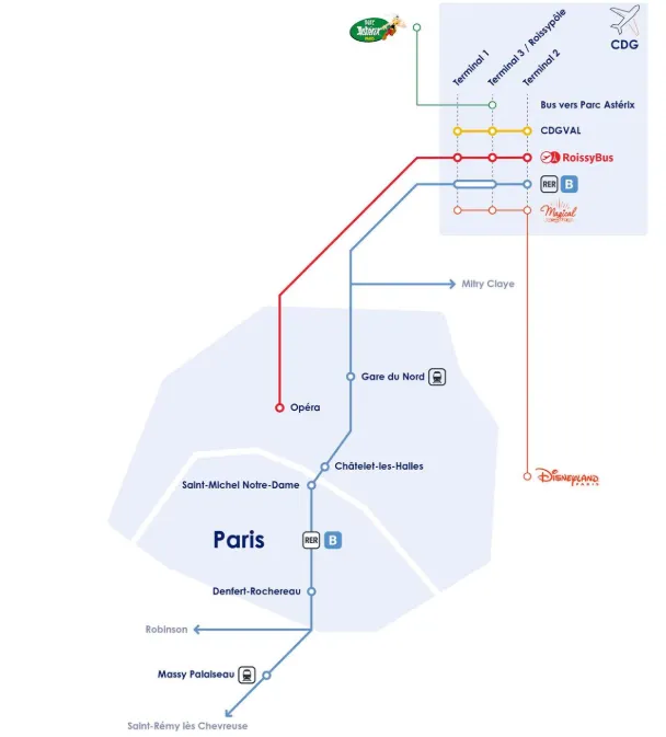 從 CDG(戴高樂機場)到市中心的主要交通方式是搭乘 RER B 火車、計程車和戴高樂機場巴士。