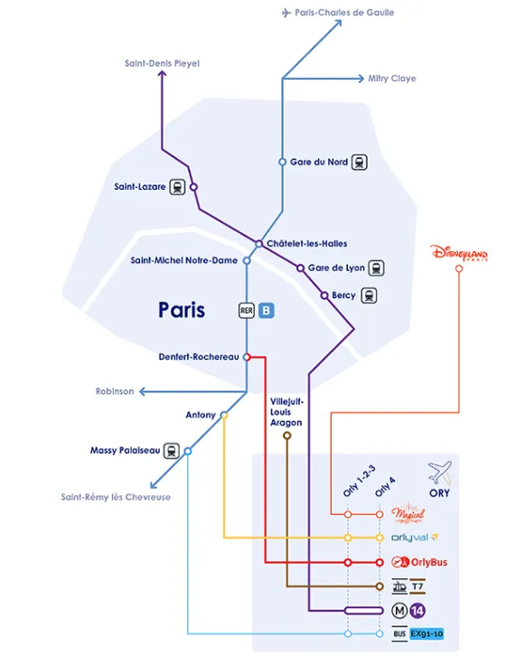 穿梭巴士主要開往巴黎馬約門站,需線上預訂。例如,您可以在線上預訂,費用為16.90歐元。行程時間較長,價格不菲,可能會造成不便。