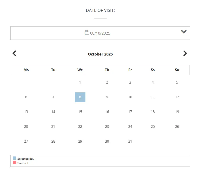 빨간색으로 보이는 날짜는 매진된 날짜이므로 선택할 수 없습니다.