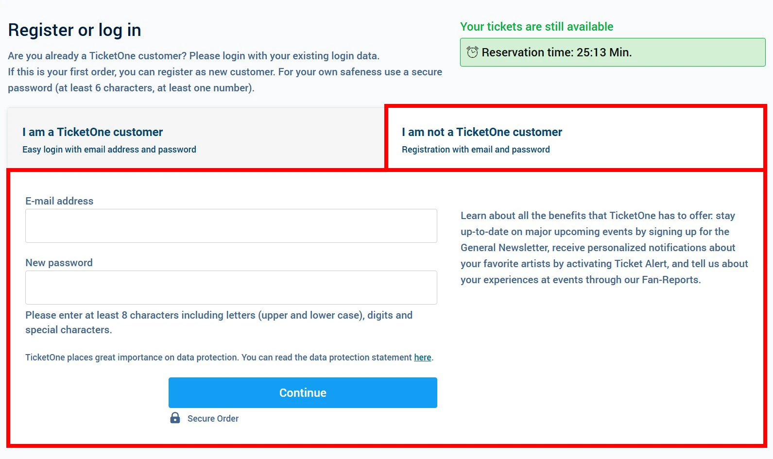 您可以通过点击右侧的“我不是 TicketOne 客户”继续注册。